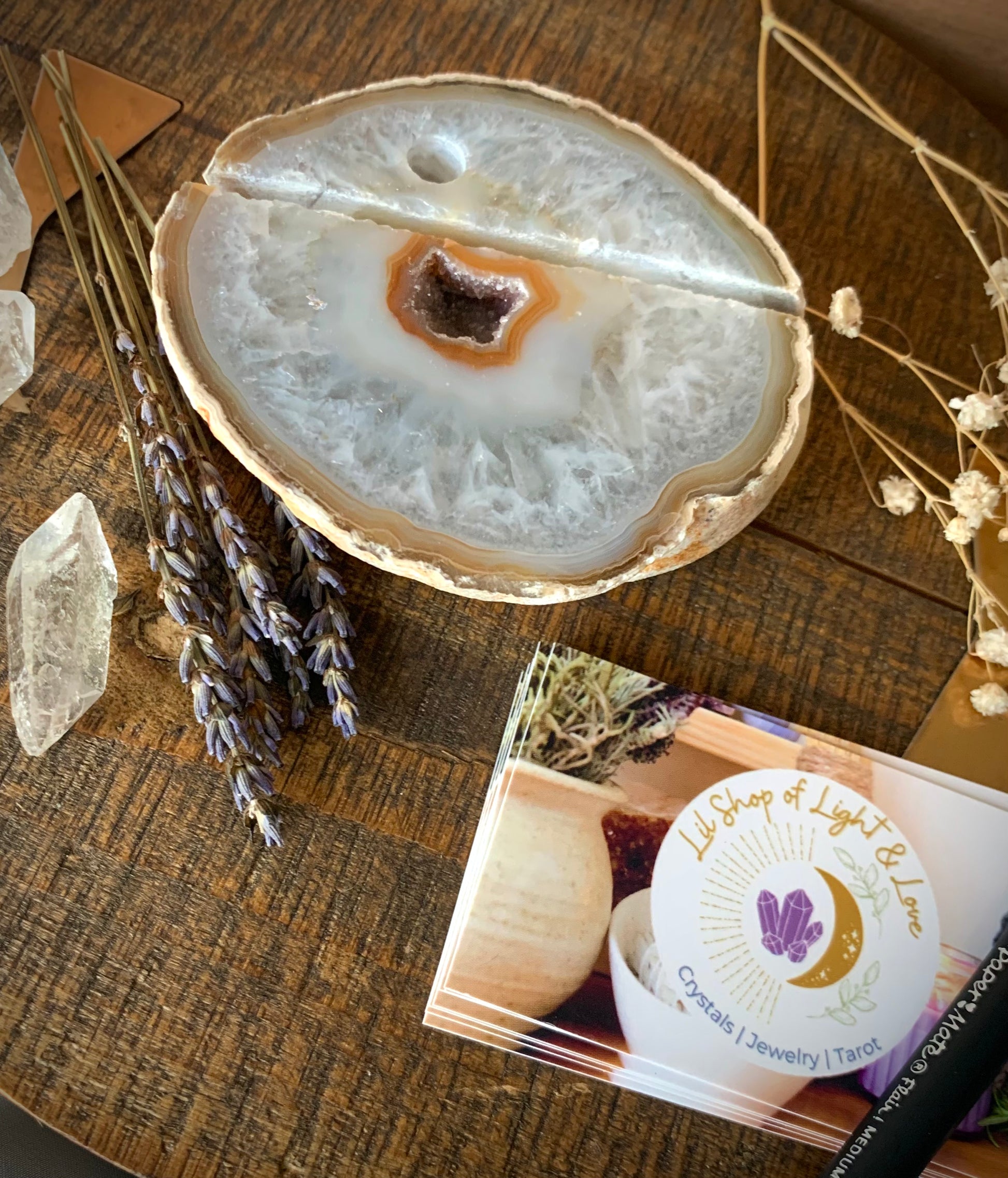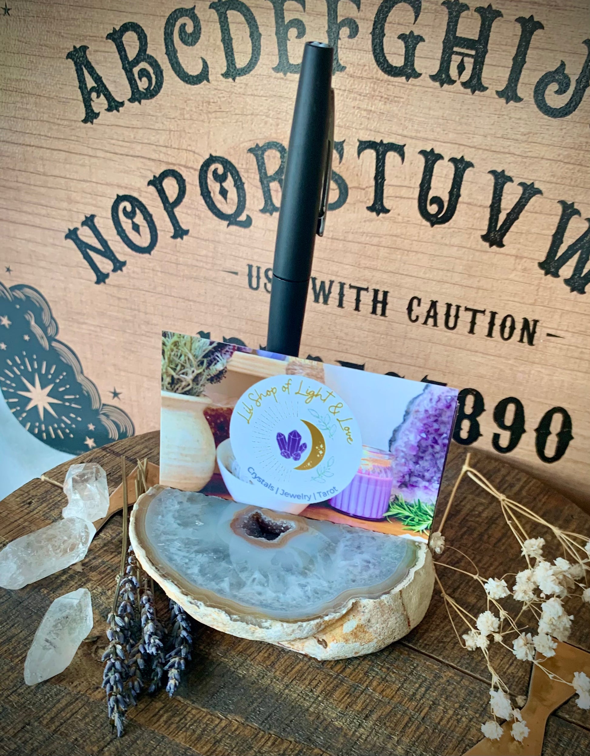 these beautiful crystal card holders are made from rough minerals and each one is unique. they’re perfect to use with tarot or oracle cards, perhaps leaving a card up to focus on for the day or while you journal. they can also be used as business card holders, place card holders at a lovely diner party, hold a recipe card or a favorite picture!