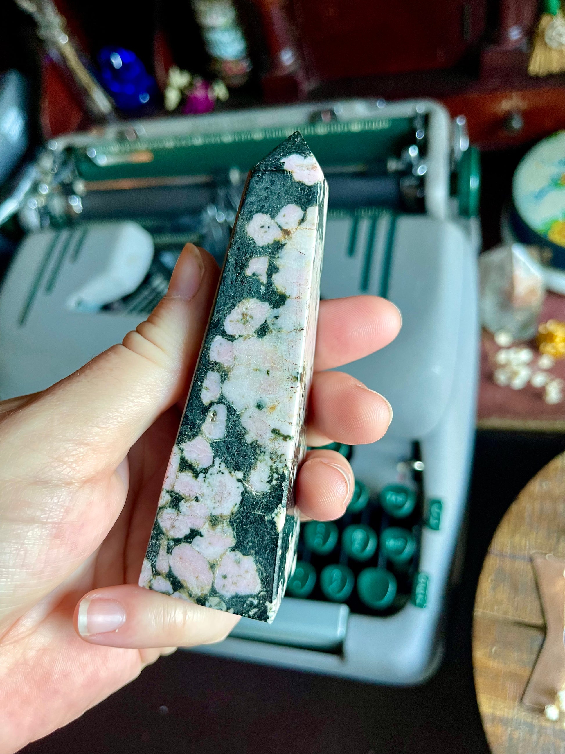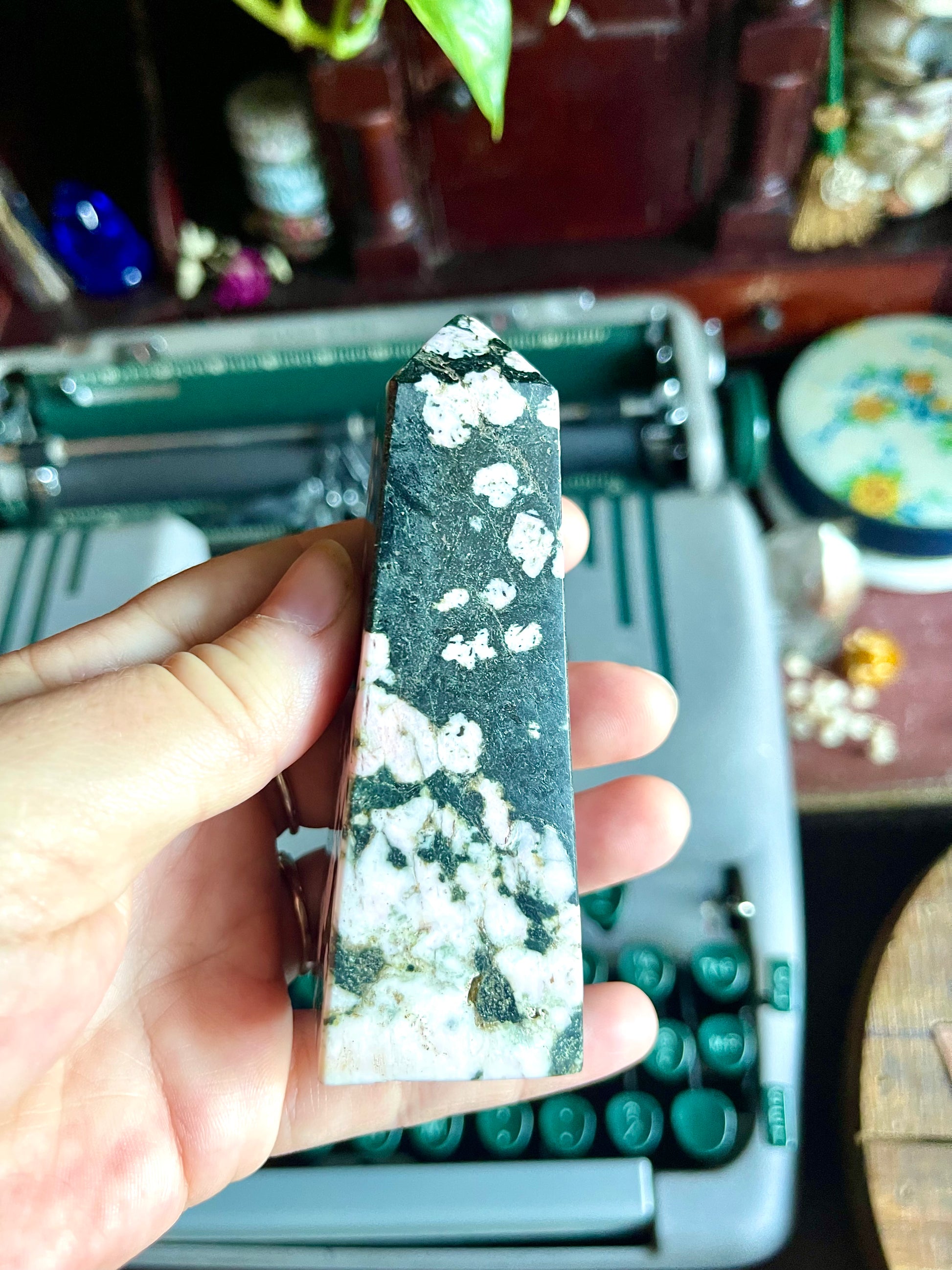 meet the rather rare, pink snowflake obsidian, also called red snowflake obsidian or himalayan pink snowflake obsidian.