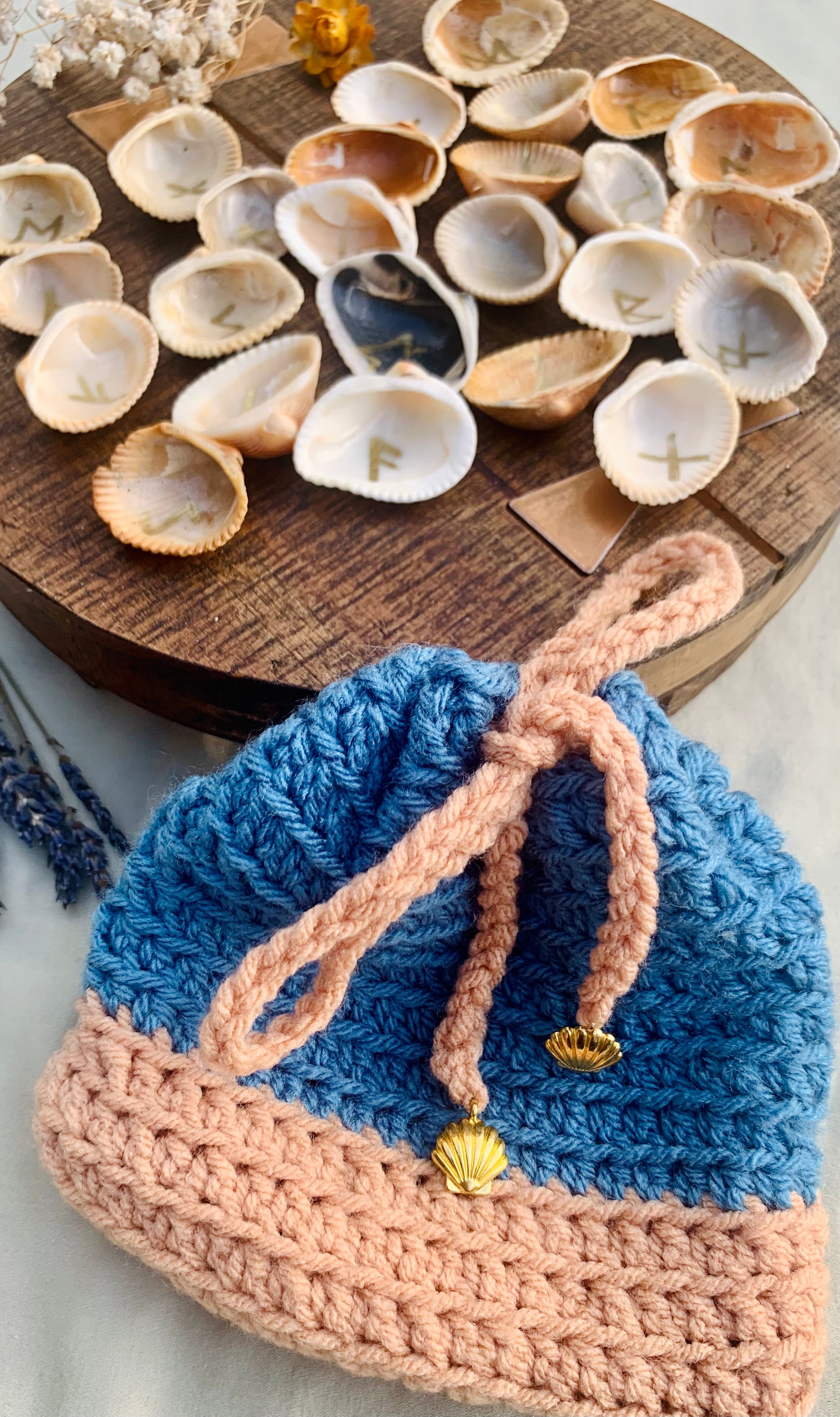 your sea witch’s runes come nestled in a beautiful, hand-crocheted pouch, made by the incredibly talented christa at crochet witch wares (find her on ig @crochetwitchwares)! to keep your sea witch’s runes safe & carry them with you on your witchy adventures. each pouch & rune set is completely unique, but they are all brimming with magick.